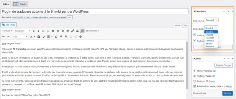 a. Când editați o pagină sau un articol, veți vedea o nouă casetă numită „AI Translator” în panoul lateral.